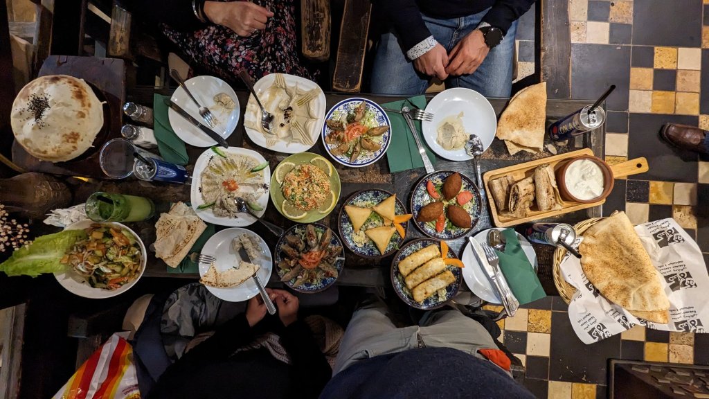 Cenone di Capodanno: prenotazione anticipata da Rakwet Kanaan, ristorante tradizionale con piatti mezè e grigliate miste. Menù completo a 25 JOD a persona. Atmosfera accogliente, musica dal vivo, famiglie e viaggiatori locali. Festeggiamenti sobri ma autentici: pochi alcolici, ma tanto tè, dolci e danze.