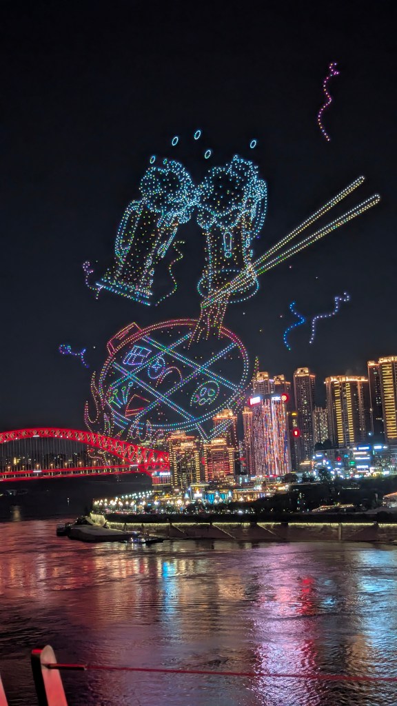 Ogni sabato alle 21:00, centinaia di droni disegnano figure luminose sopra il fiume, nel cuore di Chaotianmen Square.