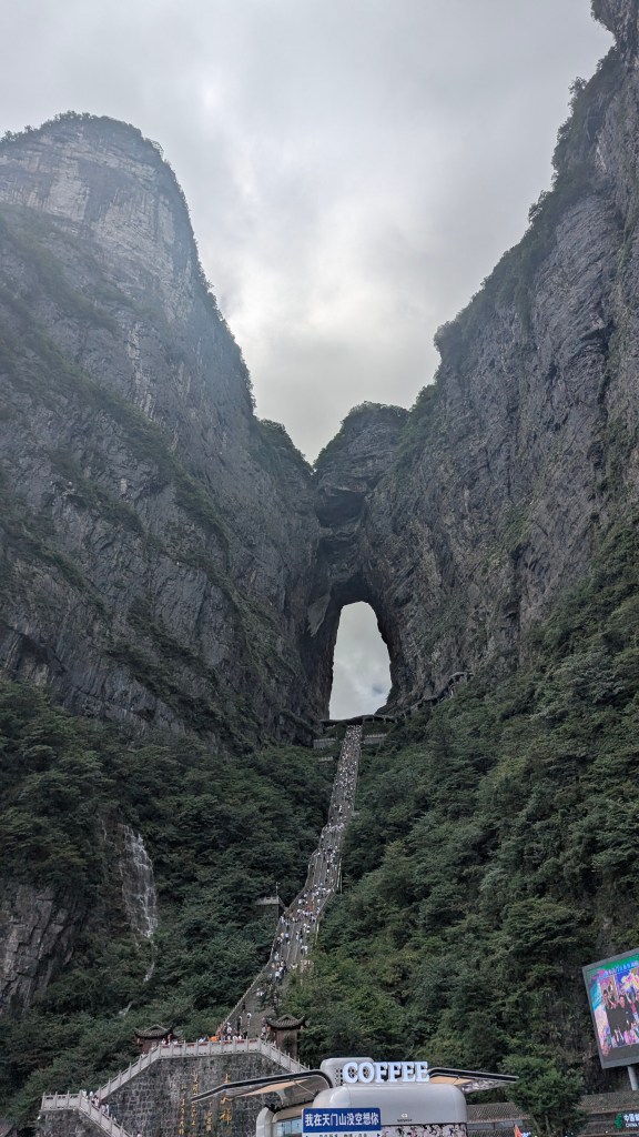 La funivia sale tra nuvole e montagne vertiginose, offrendo già panorami mozzafiato, ma il vero momento da brivido è stato raggiungere la Scalinata del Paradiso: oltre 999 gradini che conducono al Tianmen Cave, l’enorme arco naturale nella roccia, un portale sospeso tra cielo e terra.