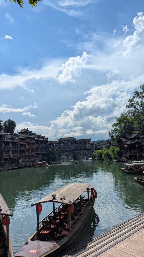 Siamo arrivati a Fenghuang con il treno delle 9:33 da Wulingyuan. Dopo circa un’oretta di viaggio, siamo scesi in stazione e abbiamo preso la navetta per l’Old Town: biglietto 7 ¥ a testa, circa 20 minuti di tragitto, che ci hanno lasciato nel cuore della città nuova. Di giorno la città appare quasi addormentata: poche persone in giro, strade silenziose e negozi semiaperti. Qui abbiamo scoperto subito che Didi non funzionava, almeno per noi: nonostante vari tentativi di ricerca, nessun driver disponibile. Alla fine, con un po’ di fatica e qualche gesto, siamo riusciti a convincere un taxi locale, con una chiamata al nostro albergo, e in circa 10 minuti e 20 ¥ (senza tassametro) siamo arrivati a destinazione.