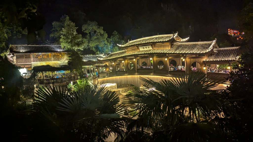 I piccoli ristoranti affacciati sull’acqua emanano profumi invitanti, le lanterne pendono leggere sul fiume, e il rumore della città sembra dissolversi nel riflesso delle luci. Fenghuang di notte non è più la città silenziosa diurna: è un luogo vivo, sospeso tra passato e presente, dove ogni passo diventa un piccolo incontro con la tradizione e il fascino cinese inquinato solo dalle decine di geishe sul fiume impegnate nei loro shooting fotografici.