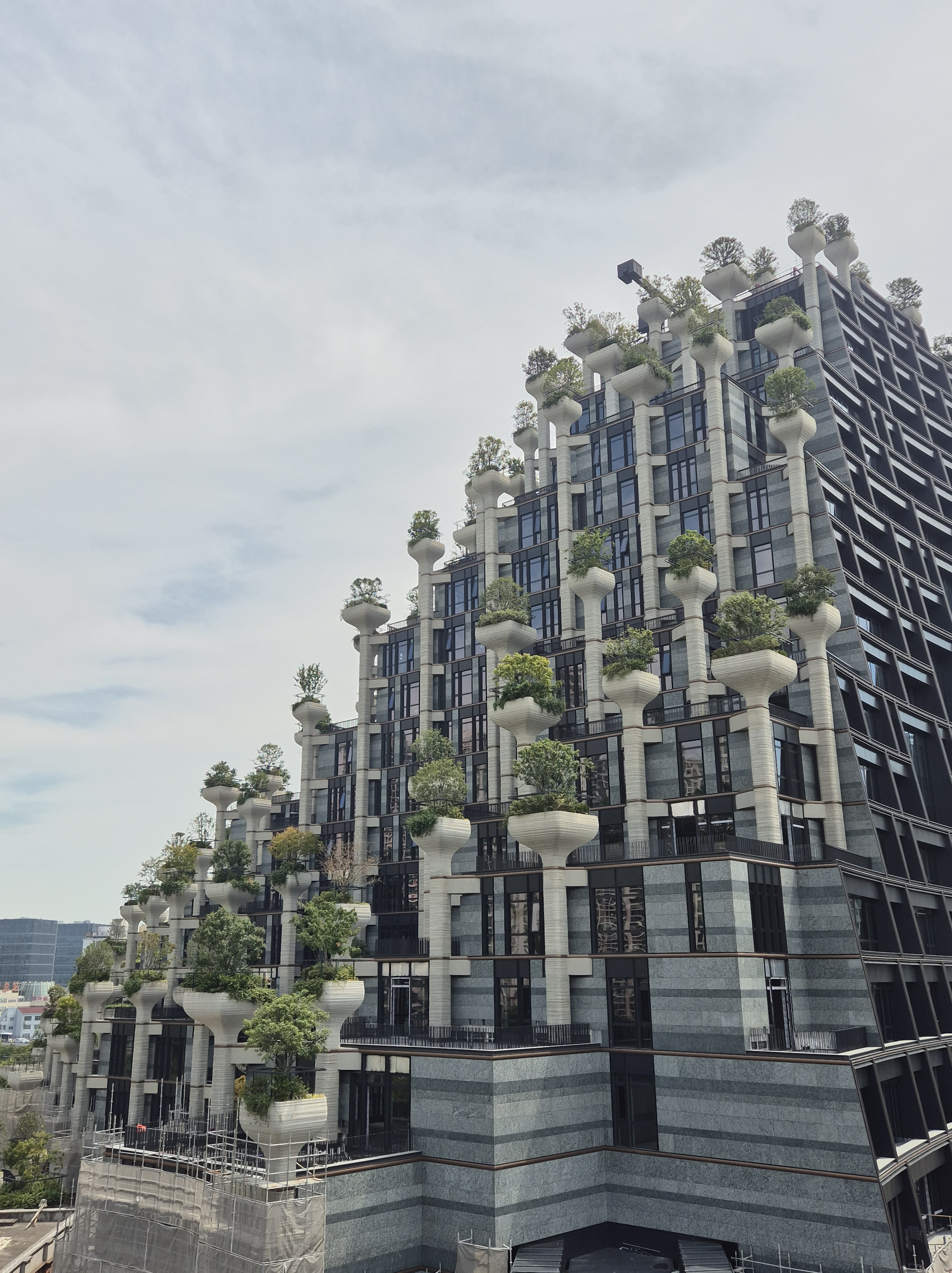 La mattina mi dirigo al quartiere artistico di M50, un complesso di ex fabbriche trasformate in studi d’arte e gallerie. A causa dell’orario mattutino o della stagione, lo trovo semivuoto, quindi decido di dirigermi a vedere uno degli edifici più stravaganti di Shangai, il 1000 Trees, un complesso residenziale e commerciale famoso per la sua facciata ricoperta di piante sospese che creano un effetto di foresta verticale urbana, fondendo natura e architettura in modo innovativo.